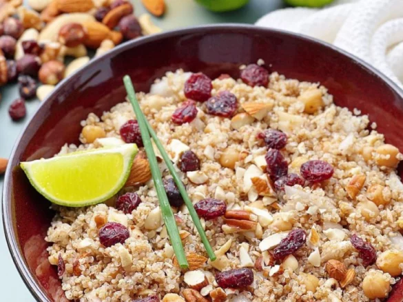 **1. Ensalada de quinoa con frutos secos y aderezo de limón:** – Cocina la quinoa hasta que absorba el agua. – Mezcla con espinacas, nueces picadas y rodajas de manzana. – Combina zumo de limón, aceite de oliva y un toque de miel para el aderezo. Este plato combina crocancia y frescura, ideal para comenzar la velada.